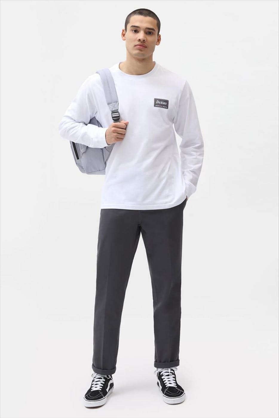 De donkergrijze Dickies Slim Fit Work Pant is gemaakt uit die typische, stevige poly-cotton. Deze chino heeft een normale taillehoogte en een ritssluiting. Vooraan heb je 2 steekzakken, achteraan 2 ingewerkte, waarvan de linker met knoop. Met deze broek spring je zo op jouw skateboard. Of achter jouw bureau. Of op jouw fiets, naar school toe...Een all-round broek dus!