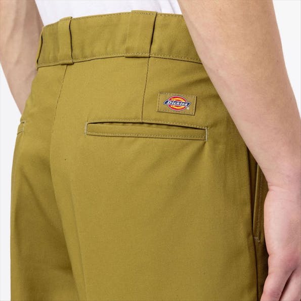 Deze 874 Original Work Pant van Dickies is gemaakt uit een stevige stof die tegen een stootje kan. De olijfgroene broek heeft een straight fit, normale taillehoogte en sluit met een rits en schuifknop. De chino heeft vooraan twee steekzakken, achteraan twee ingewerkte zakken waarvan één sluit met een knoop. De stof is 'kreukresistent', heerlijk in onderhoud.
