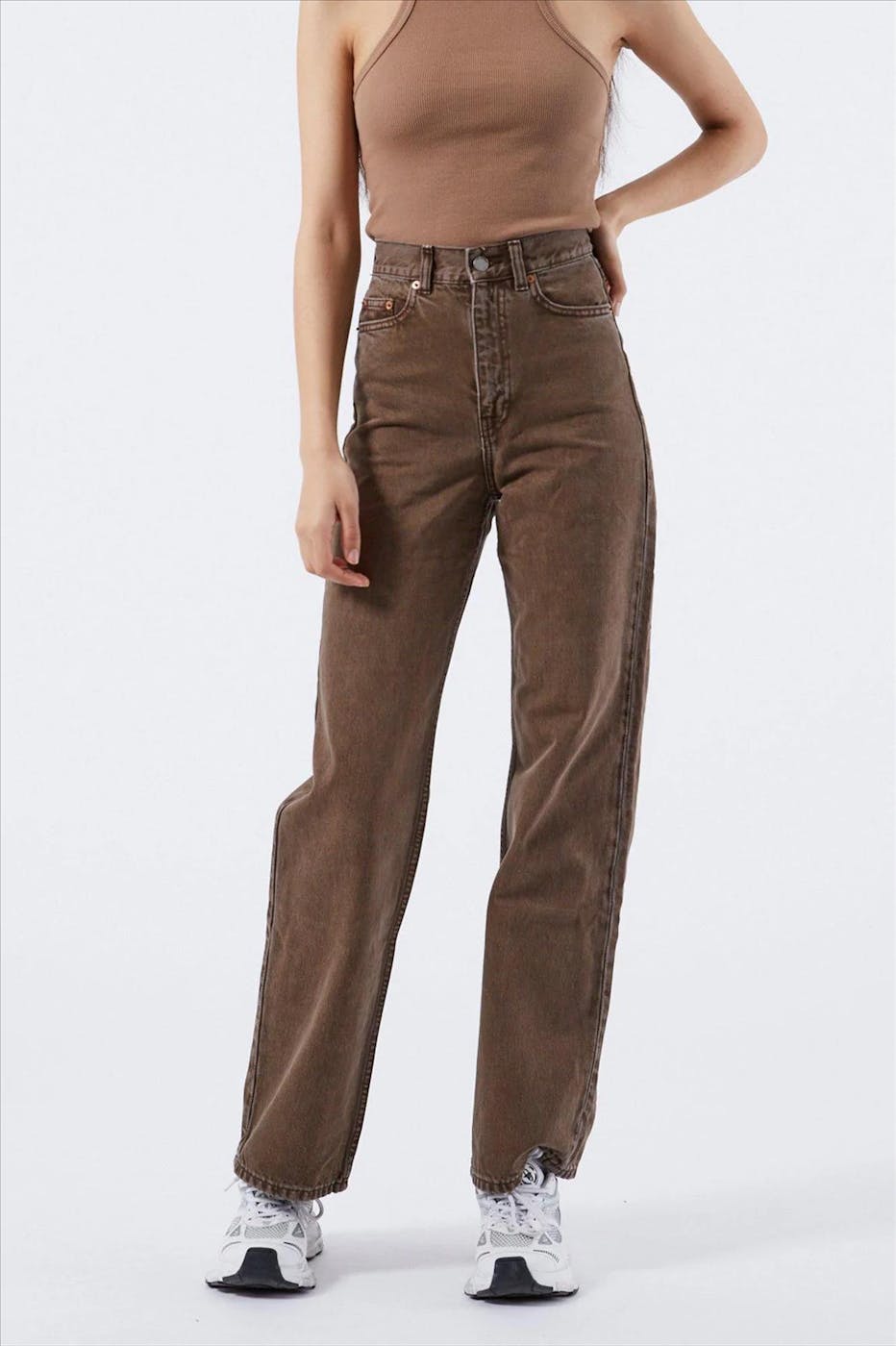 De Dr.Denim Echo heeft een straight/wide fit en een hoge taille. Deze 5-pocket heeft een ritssluiting. Rivetten en extra stiksels verstevigen de meer kwetsbare delen, zoals aan de zakken en aan de heup. Deze jeans heeft een bruine uitvoering.