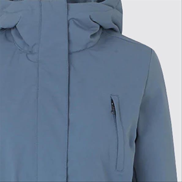 Denise jas in blauw is getailleerd, heeft een kap en een verborgen ritssluiting aan de voorkant. De jas heeft 2 borstzakken met ritssluitin, 2 zijzakken met knoopsluiting en een binnenzak. De jas is gevoerd met Thermolite polyester vulling, die bekend staat om zijn hoge isolatiewaarde en daarom de perfecte keuze is voor koude winters.