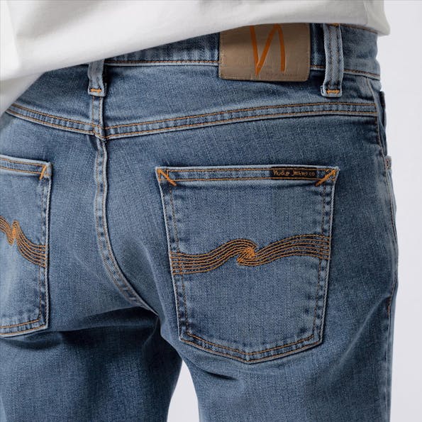 De Lean Dean is een slim fit 5-pocket, heeft een normale taille en een ritssluiting. Vanop de dijen heeft de Lean Dean een tapered fit, wat betekent dat hij versmalt naar de enkels toe. De stiksels op de zakken zijn klassiek en typisch Nudie Jeans.