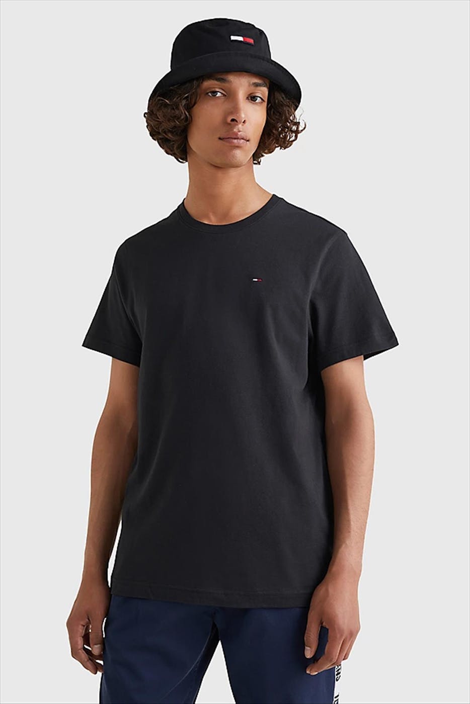 Zwart basis T-shirt van Hilfiger Denim met ronde hals en korte mouw. Herkenbaar rood-wit-blauw vlagje geborduurd op de borst. Oogt mooi onder een hemd, maar kan ook zo gedragen worden voor een sobere look.